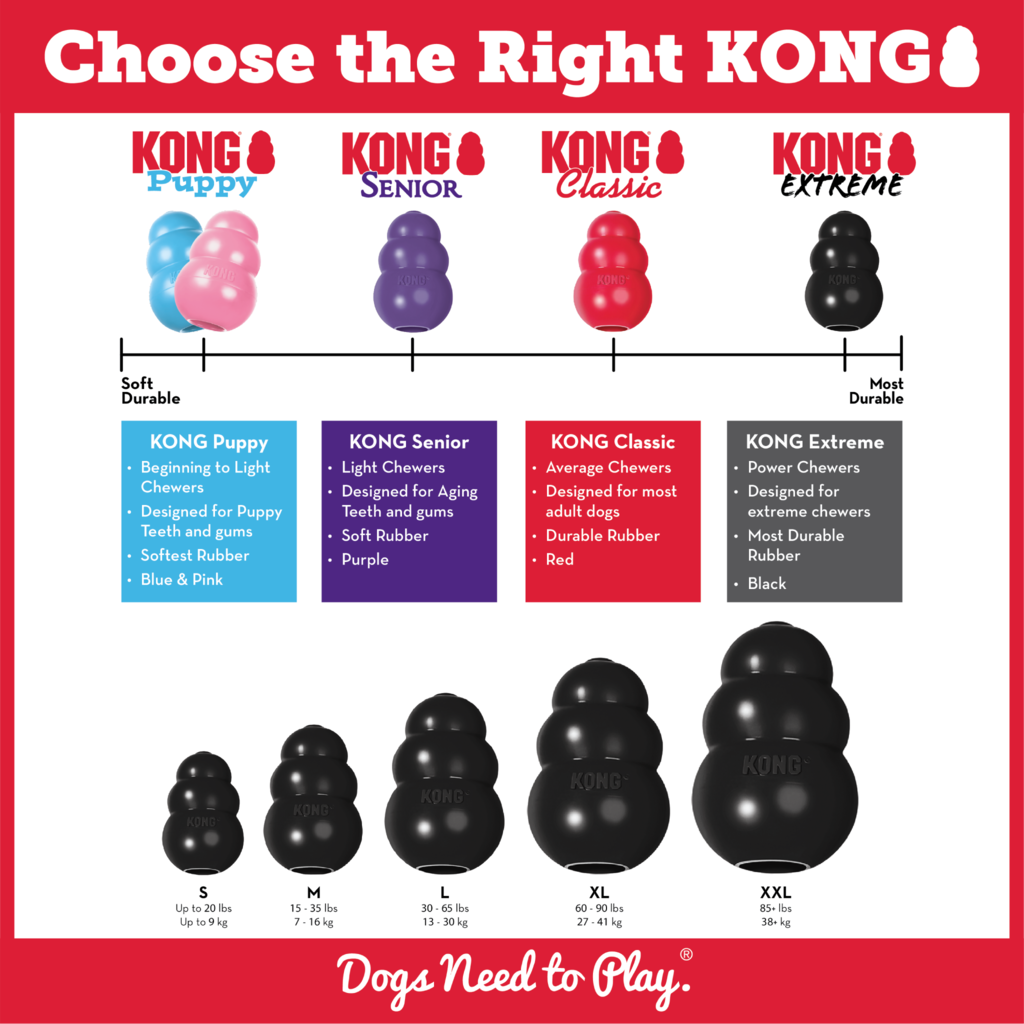 Para los masticadores más tenaces, el KONG® Extreme ofrece la máxima durabilidad con su exclusiva fórmula de caucho natural ultrarresistente. Su rebote errático satisface las necesidades de juego y masticación intensas. Ideal para rellenar con premios como KONG® Easy Treat o Snacks, proporcionando un desafío mental adicional y prolongando el tiempo de juego. Recomendado para perros con mandíbulas fuertes y hábitos de masticación agresivos.